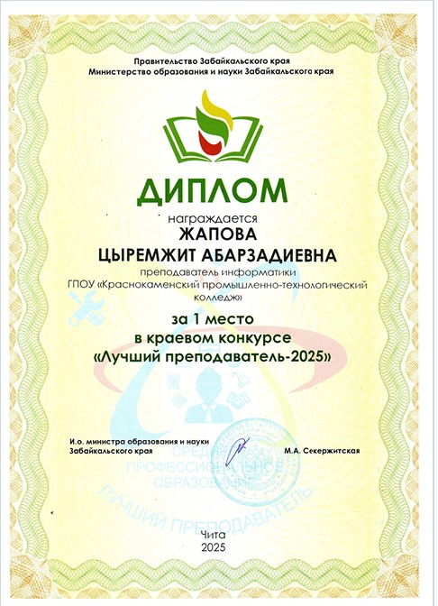 Диплом победителя краевого профессионального конкурса "Лучший преподаватель СПО-2025"